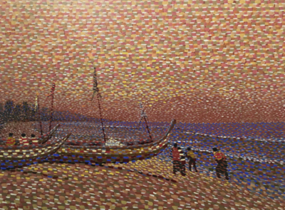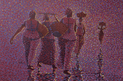 Betty Acquah, one of Accra’s foremost female painters, investigates her beliefs regarding the true nature of Ghanaian women. The trials, ambitions, celebrations and successes of ordinary but inspirational woman form the central theme of her rich and florid canvasses. After attending Wesley Girl’s High and Holy Child schools in Cape Coast; Acquah proceeded to the Kwame Nkrumeh University of Science and Technology, Kumasi where she obtained a first class degree. Acquah later pursued the M.F.A. (painting) program at Kwame Nkrumeh after a interim course at the Tokyo School of Art in Tokyo, Japan. She has worked at the Centre for National Culture in Accra, Ghana and is currently working at the Berj Art Gallery, Accra. Acquah has participated in exhibitions in Ghana as well as abroad. Betty Acquah maintains that women are the unsung heroines of the Ghanaian Republic. The images she depicts tell of ordinary women working courageously towards a greater Ghana.